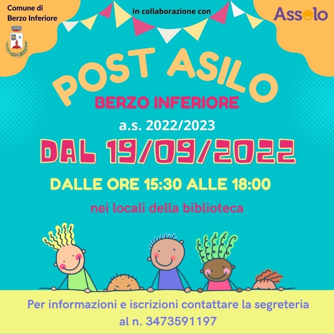L’amministrazione comunale di Berzo Inferiore in collaborazione con Assolo propongono per l’anno scolastico 2022-2023, in continuità con i precedenti anni scolastici, il POST ASILO per bambini che frequentano la scuola dell’infanzia “Piccoli Passi” di Berzo Inferiore .