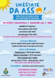 Il progetto che si realizzerà a Sulzano presso l’Oratorio di Sulzano e sul territorio circostante, grazie alla collaborazione con l’amministrazione comunale di Sulzano e con la parrocchia di S. Giorgio, prenderà il via lunedì 8 luglio e proseguirà fino a venerdì 26 luglio nei giorni feriali (sabato escluso), dalle 08:30 alle 18:00  e partirà al raggiungimento di almeno 15 iscritti.