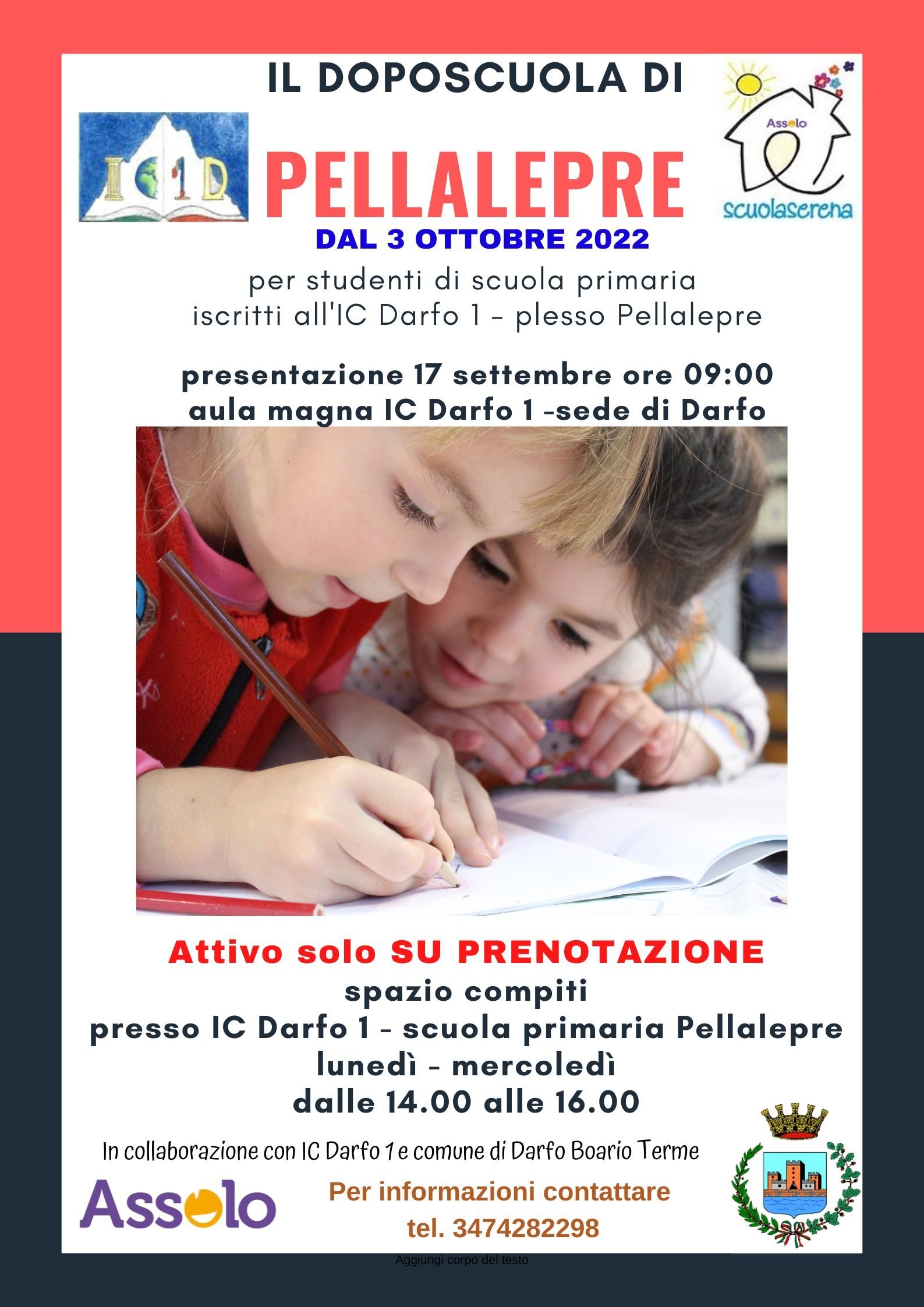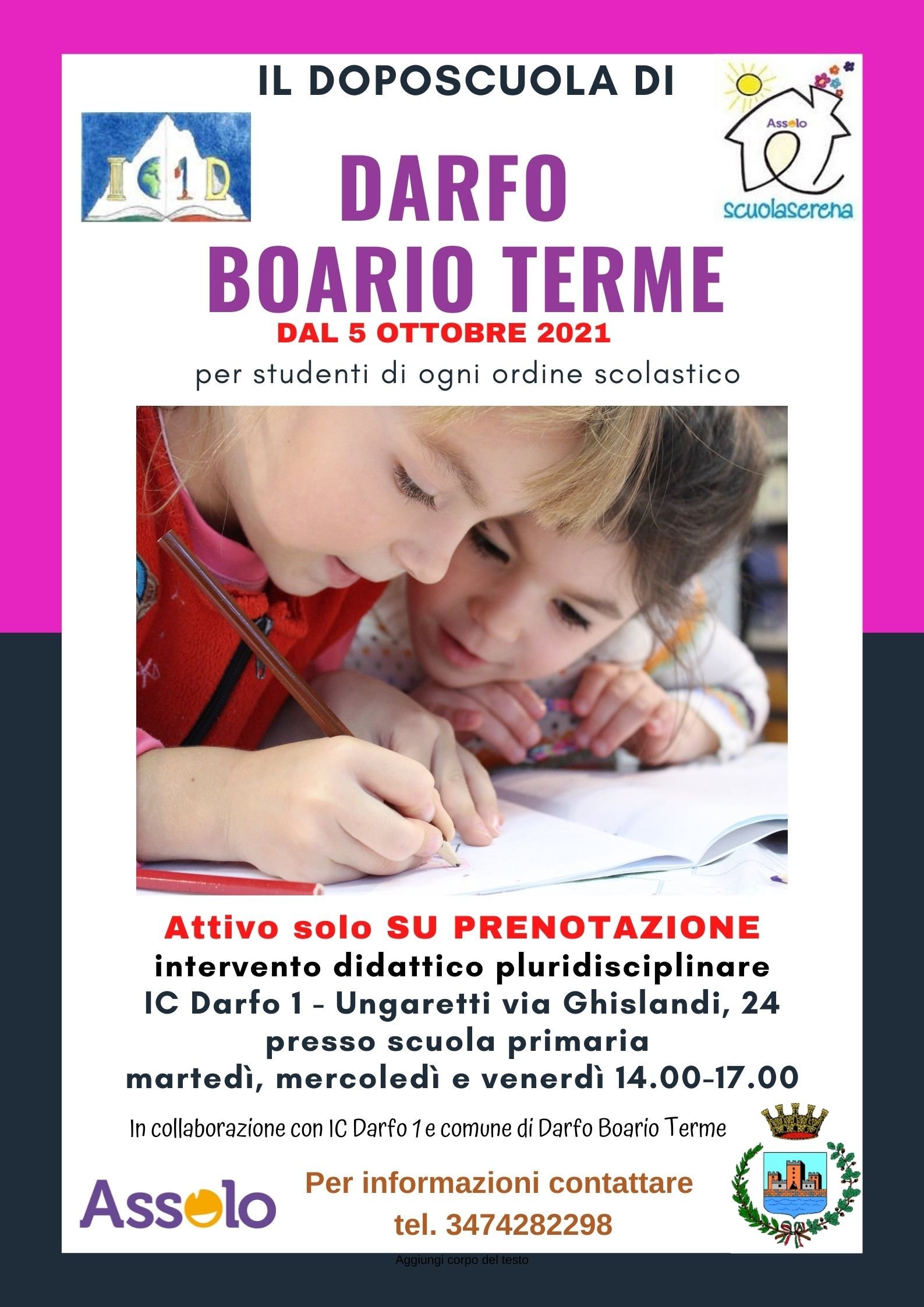I DOPOSCUOLA DI ASSOLO – Darfo 1 Ottobre 3, 2022 @ 2:30 pm - Giugno 2, 2023 @ 5:00 pm Sede di Darfo Boario Terme - Darfo 1 a richiesta