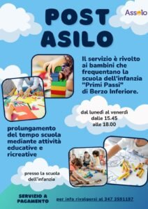 ASSOLO, in collaborazione con Istituto Comprensivo G. Romanino propone anche per il prossimo anno scolastico (2024/2025) il servizio di POST ASILO per i bambini che frequentano la scuola materna “Primi Passi” in via XXIV Maggio, 30 a Berzo Inferiore (BS) .