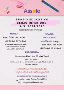 ASSOLO propone anche per il prossimo anno scolastico (2024/2025) il servizio SPAZIO EDUCATIVO per i bambini residenti a Berzo Inferiore e che frequentano la scuola primaria.